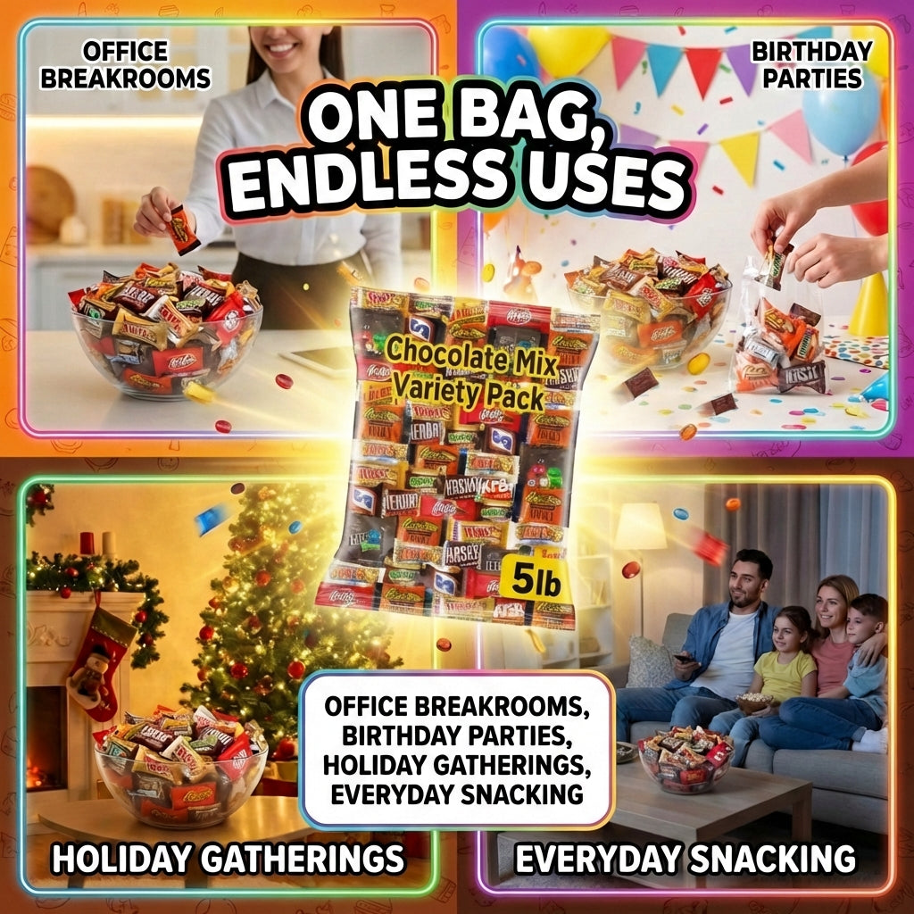 This chocolate variety pack is a top choice for those searching for bulk chocolate candy, individually wrapped sweets, milk chocolate mini bars, dark chocolate snacks, assorted candy bars, and fun-size chocolate treats. Perfect for candy mixes at parties, holiday gift bags, stocking stuffers, or office snack stations, this bulk chocolate assortment delivers delicious variety for every occasion.